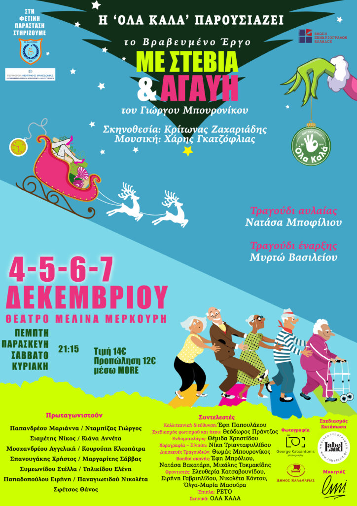 Η βραβευμένη θεατρική ομάδα ΟΛΑ-ΚΑΛΑ (Θεατρικά Βραβεία Θεσσαλονίκης 2024) μετά από συνεχόμενα sold out, παρουσιάζει για δεύτερη χρονιά στο θεατρόφιλο κοινό της Θεσσαλονίκης την σπαρταριστή κωμωδία «Με Στέβια και Αγαύη» στο Θέατρο Μελίνα Μερκούρη, Καλαμαριάς.