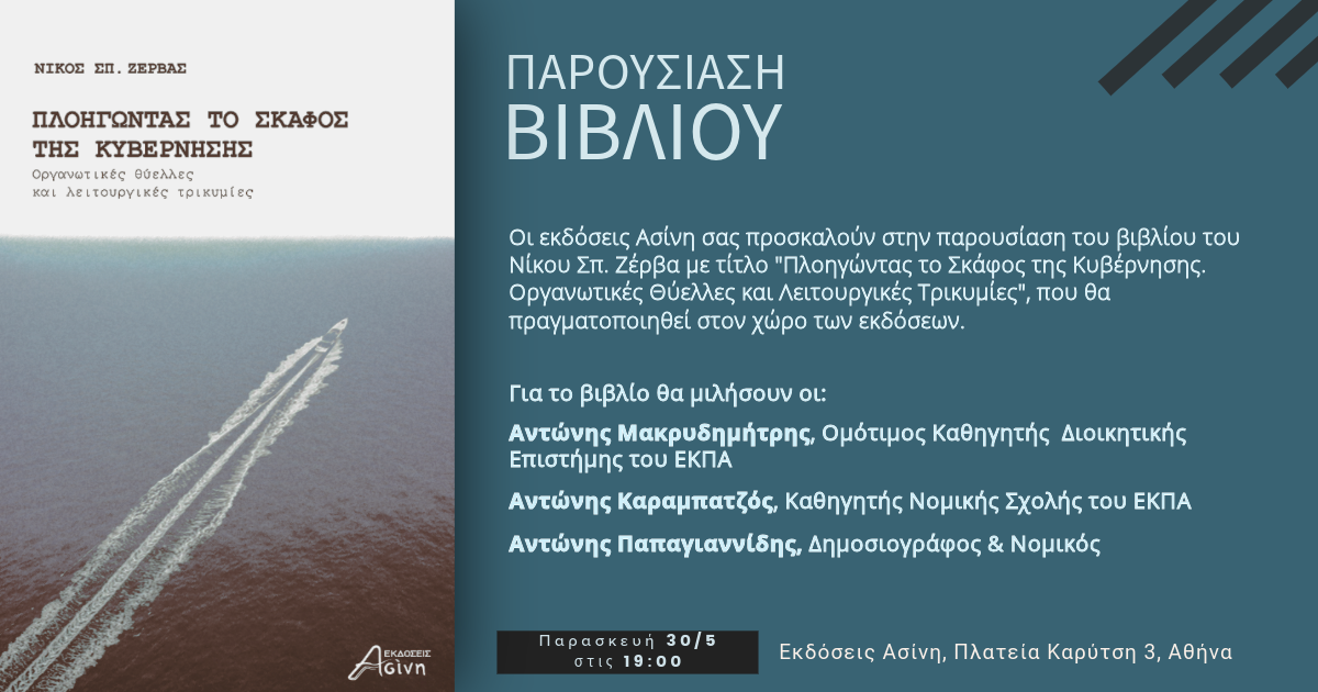 Οι εκδόσεις Ασίνη σας προσκαλούν στην παρουσίαση του βιβλίου του Νίκου Σπ. Ζέρβα με τίτλο “Πλοηγώντας το Σκάφος της Κυβέρνησης. Οργανωτικές Θύελλες και Λειτουργικές Τρικυμίες”, που θα πραγματοποιηθεί στον χώρο των εκδόσεων.