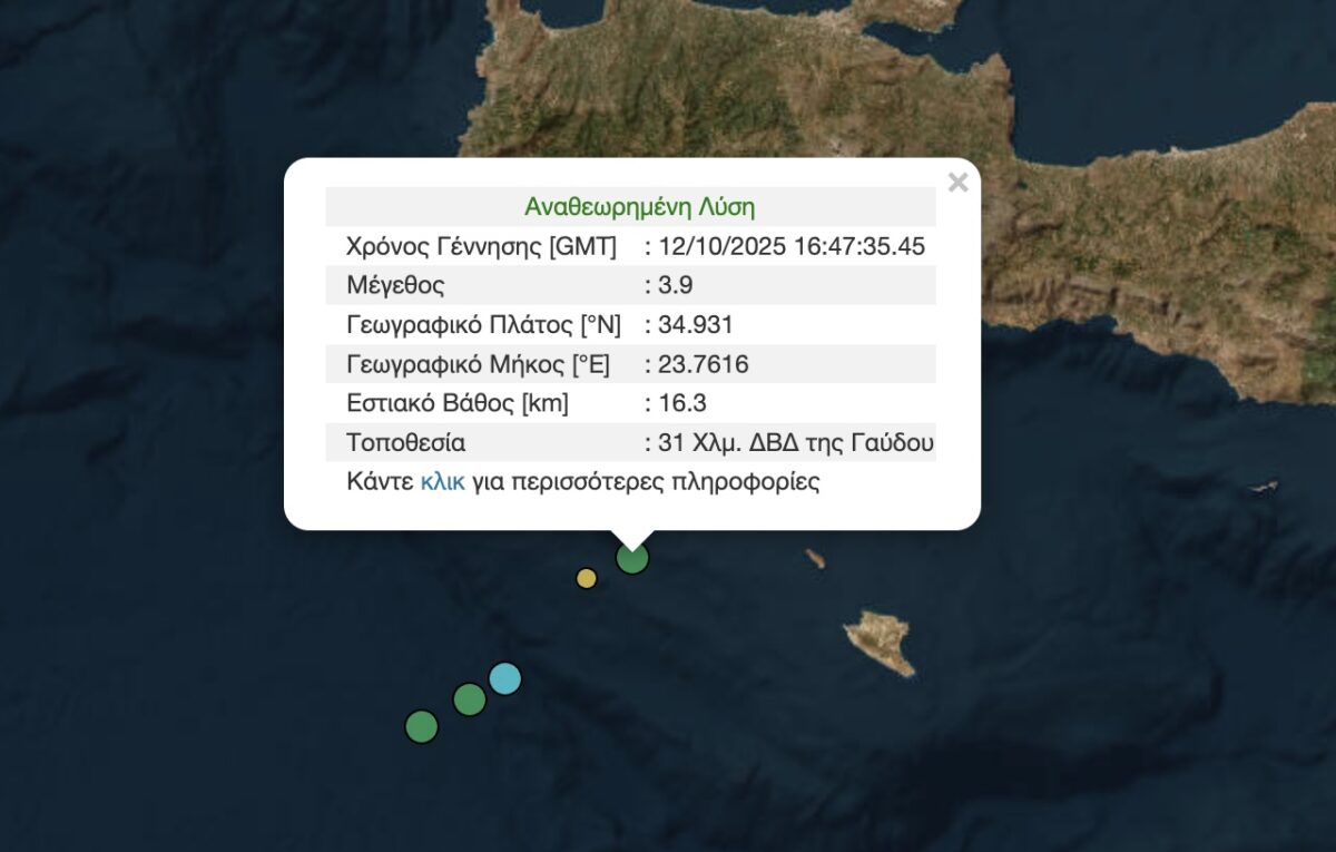 Συγκεκριμένα, σύμφωνα με την αναθεωρημένη λύση του Γεωδυναμικού Ινστιτούτου, ο σεισμός καταγράφηκε στις 19:47 και το επίκεντρο εντοπίστηκε 31 χιλιόμετρα δυτικά-βορειοδυτικά της Γαύδου.