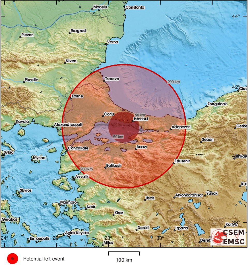Η AFAD ανακοίνωσε σεισμό μεγέθους 5 βαθμών, ανοιχτά της περιοχής Μαρμαρά, έγινε αισθητός σε Κωνσταντινούπολη, Προύσα και Τσανάκαλε, στις 14:55, σε βάθος 6,71 χλμ.