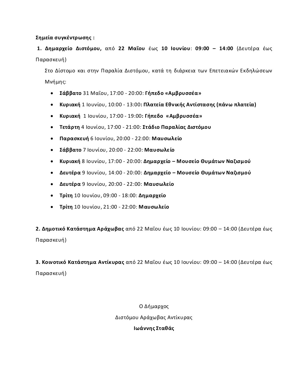 Οι προσφορές θα συγκεντρώνονται και στα σημεία των πολύπτυχων και πολυήμερων εκδηλώσεων Μνήμης και Ελπίδας για τους σφαγιασθέντες 228 κατοίκους του Διστόμου, αλλά και στα κοινοτικά καταστήματα όλων των χωριών του Δήμου Διστόμου Αράχωβας Αντίκυρας <<Δεν μπορούμε να μένουμε αμέτοχοι στο συνεχιζόμενο έγκλημα κατά της ανθρωπότητας στην Γάζα>>, είναι το μήνυμα.