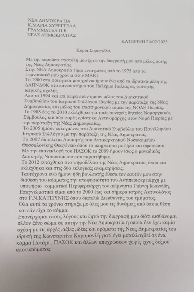 Διαμαρτύρομαι γι αυτό επίσης υποβάλλω την παραίτησή μου γιατί δεν διαγράφεται ποτέ ένας πρώην πρωθυπουργός που οι απόψεις του ήταν πάντα ίδιες και εθνικές. Γιατί δεν διαγράφεται ένας πρώην πρόεδρος κόμματος που εξελέγη με 400.000 ψήφους από 800.000 νεοδημοκράτες. Γιατί δεν μπορεί κάποιοι χθεσινοί του Μαξίμου να διαγράφουν ένα από τα ιδρυτικά μέλη της παράταξης. Για τους παραπάνω λόγους ζητώ την διαγραφή μου.