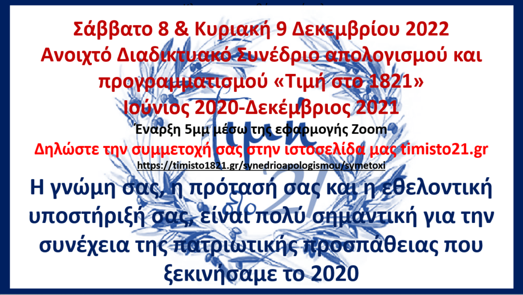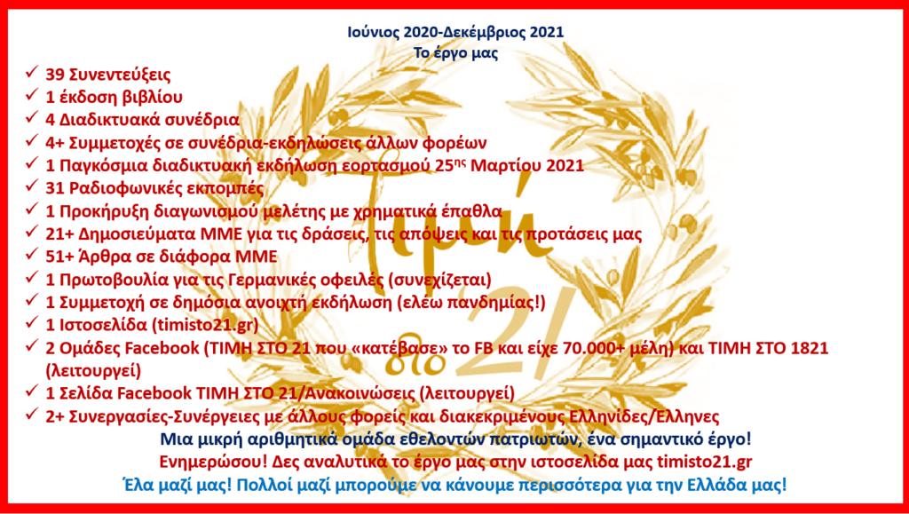 *Ότι η (ανεπίσημη) Επιτροπή μας ΤΙΜΗΣΤΟ 21 είχε μια χειμαρρώδη δραστηριότητα που συνεχίζεται (παρότι σκιώδης, εφόσον τα συστημικά ΜΜΕ την αγνοούν) σε όλους τους τομείς του εορτασμού της επετείου, που επέτρεπε η πανδημία, αλλά και τα περιορισμένα οικονομικά μέσα μας (από την πώληση του βιβλίου μας και από μικρές ιδιωτικές δωρεές). Το κέντρο των προσπαθειών μας ήταν η αντίδραση στον εθνομηδενισμό, που τρώει ως σαράκι την πατρίδα μας, καθώς και η διαπίστωση ότι από τους δύο βασικούς στόχους της Επανάστασης: ελευθερία και ανεξαρτησία, ο δεύτερος δεν υλοποιήθηκε και ρίχνει τη βαριά του σκιά στο σύνολο του χειρισμού των προβλημάτων μας, εθνικών, οικονομικών, δημογραφικών, κλπ. Με επίκεντρο την υποτέλεια και τις δυσμενείς της συνέπειες διοργανώσαμε ήδη 3 διαδικτυακά συνέδρια και ετοιμάζουμε το 4ο, που θα αναφέρεται στους χειρισμούς για το μεταναστευτικό/λαθρομεταναστευτικό.