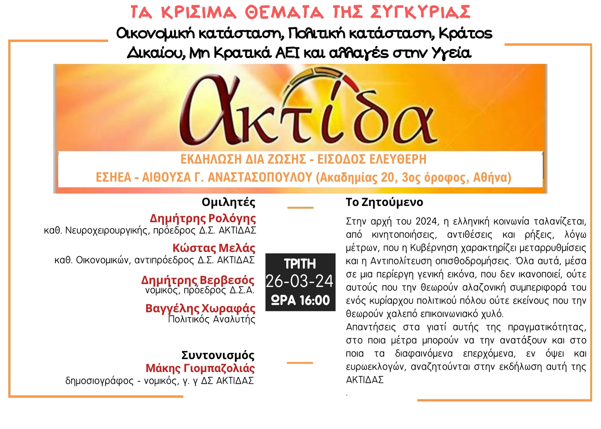 O Όμιλος ΑΚΤΙΔΑ διοργανώνει εκδήλωση, δια ζώσης και με ελεύθερη είσοδο, στην αίθουσα “Γ. Αναστασόπουλος” της ΕΣΗΕΑ ( Ακαδημίας 20 3ος όροφος Αθήνα ), την 26 Μαρτίου 2024, ώρα 16.00, με θέμα: “Τα κρίσιμα θέματα της συγκυρίας”