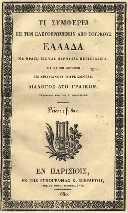Τον Οκτώβριο του 1830, σε νέο κείμενό του- διάλογο, που διαμείβεται μεταξύ των Γραικών Λαοσθένους και Χαριλάου ο Κοραής κρίνει την πολιτική του Καποδίστρια σε συνδυασμό με το πρόσφατο γαλλικό πολιτικό κίνημα, που ανέτρεψε το καθεστώς των Βουρβόνων και οδήγησε στην εγκαθίδρυση του Λουδοβίκου Φιλίππου. Οι συνομιλητές στηλιτεύουν τα δεσποτικά καθεστώτα, όπως εκείνο των Βουρβόνων και θριαμβολογούν για την επανάσταση του γαλλικού λαού, που θέρισε τους τυράννους «ως το δρέπανον της κατά των επιόρκων προφητείας του Ζαχαρίου».