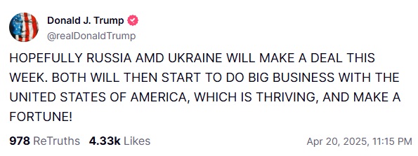 «Ας ελπίσουμε η Ρωσία και η Ουκρανία να καταλήξουν σε μια συμφωνία αυτήν την εβδομάδα», έγραψε ο Αμερικανός πρόεδρος.