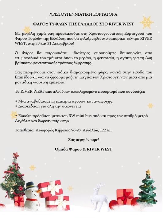 Με μεγάλη χαρά ο Φάρος Τυφλών προσκαλεί στη Χριστουγεννιάτικη Εορταγορά του, που θα φιλοξενηθεί στο εμπορικό κέντρο RIVER WEST, στις 20 και 21 Δεκεμβρίου.