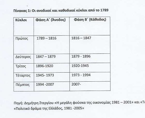 Όλα αυτά, τα οποία επαναλαμβάνω, σε κάθε ευκαιρία και σήμερα, στηρίζονταν στον παρατιθέμενο πίνακα που είχα καταρτίσει και δημοσιεύσει σε άρθρα και βιβλία μου, με τις μακροχρόνιες κυκλικές διακυμάνσεις από το 1789.