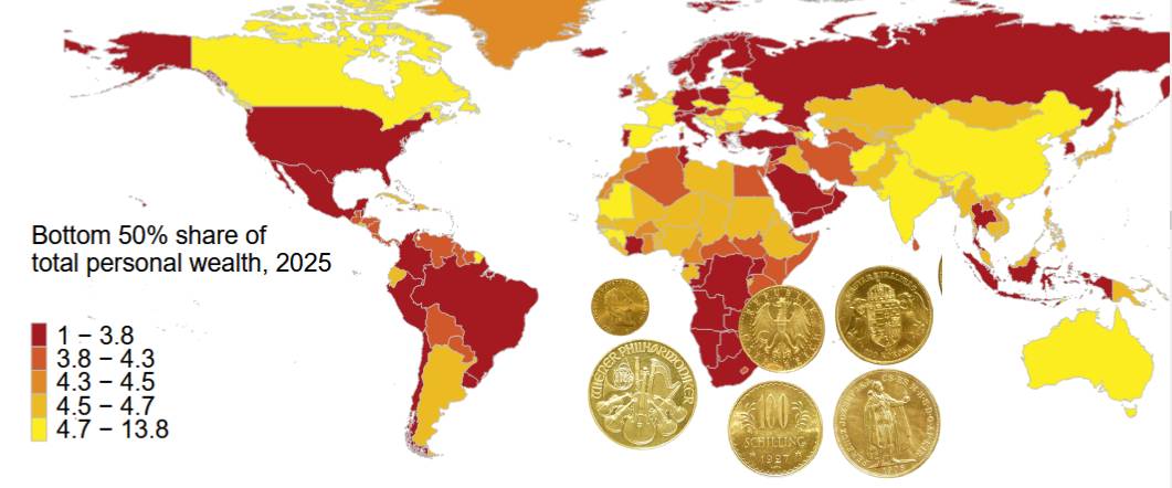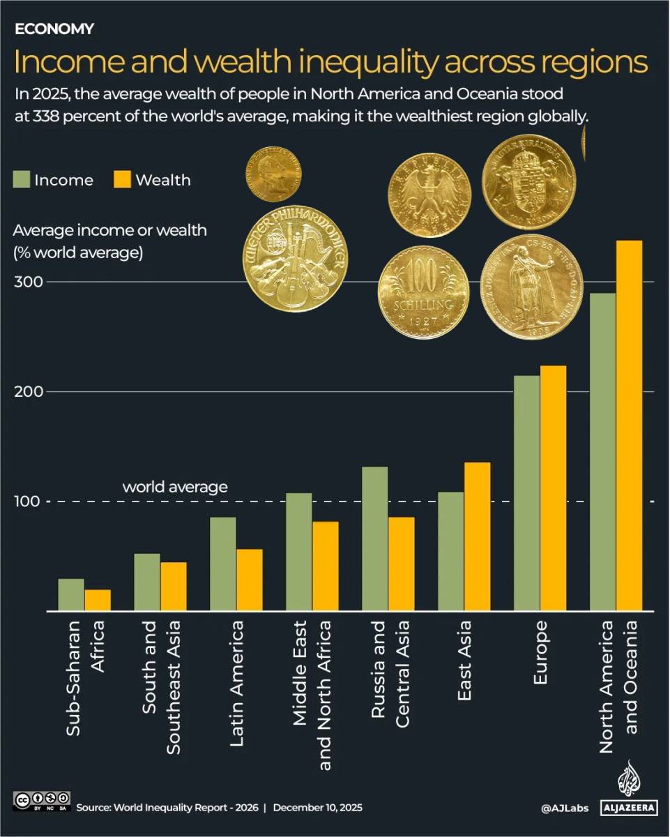 Εντούτοις η έκθεση World Inequality Report 2026, η οποία βασίζεται σε δεδομένα που συγκέντρωσαν 200 ερευνητές, θέλει να καταδείξει τη μεγάλη ανισότητα μεταξύ της πλούσιας Ευρώπης και της βόρειας Αμερικής, σε σύγκριση με αφρικανικές, λατινοαμερικανικές, αλλά και ασιατικές χώρες, οπότε δεν εστιάζεται ιδιαίτερα στις ευρωπαϊκές ανισότητες, που πάντως είναι μεγάλες. Σύμφωνα με την βρετανική εφημερίδα Guardian, που ανέλυσε κι εκείνη την έρευνα, το πλουσιότερο 10% του παγκόσμιου πληθυσμού κατέχει το 75% του πλούτου και το 50% μόλις το 2%!