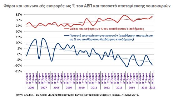 Στο Διάγραμμα 2 παρατηρούμε ότι η ακαθάριστη αποταμίευση των νοικοκυριών συνεχίζει την αρνητική της πορεία και το 2015, αλλά και στο Α’ τρίμηνο του 2016. Η αύξηση των φόρων και των ασφαλιστικών εισφορών, από το Γ’ τρίμηνο του 2014, που επιταχύνεται το Α’ τρίμηνο του 2016, επιδρά αρνητικά στην ακαθάριστη αποταμίευση των νοικοκυριών.