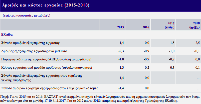 Σύμφωνα με την Τράπεζα της Ελλάδος, για το 2018 αναμένεται ότι στο σύνολο της οικονομίας το σύνολο των αμοιβών εξαρτημένης εργασίας θα αυξηθεί ταχύτερα από ό,τι το 2017, αντανακλώντας την ανάκαμψη της οικονομίας και την καλή επίδοση της απασχόλησης.