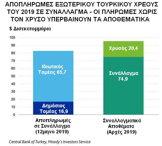 Παράλληλα το 2019 μεταφέρονται 470 τόνοι χρυσού (το 83% του συνολικού αποθέματος) από την Τράπεζα Αγγλίας και την Bank of International Settlements-BIS (Τράπεζα Διεθνών Διακανονισμών) της Ελβετίας στο Χρηματιστήριο της Κωνσταντινούπολης. Η αξία αυτού του χρυσού υπερβαίνει τα 35 δισ., αλλά διατυπώνονται αμφιβολίες για το εάν μπορούν να σώσουν την κατάσταση, λόγω του κυκεώνα των αποτυχημένων στηρίξεων του τουρκικού νομίσματος.