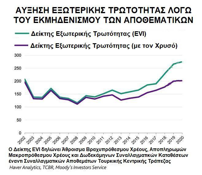 Η πώληση τουλάχιστον 128 δισ. κατά την περίοδο 2019-2020 για την στήριξη του τουρκικού νομίσματος, αποδεικνύεται –όπως προειδοποιούσαν τότε οι οικονομικοί αναλυτές– όχι μόνον μάταιη, αλλά και εξαιρετικά επικίνδυνη. Η συγκεκριμένη τακτική οδηγεί σε αρνητικά συναλλαγματικά αποθέματα, της τάξης των 47 δισ. δολαρίων, αφήνοντας την τουρκική λίρα εκτεθειμένη σε εξωτερικά πλήγματα, χωρίς δυνατότητα αποτελεσματικής άμυνας.