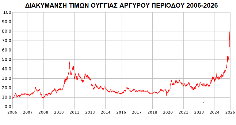 Μία άλλη σοβαρή αποχρώσα ένδειξη προκύπτει από την σχέση των τιμών του αργύρου με τις αντίστοιχες του χρυσού ανά ουγγιά, όπου από το 125:1 της περιόδου της υγειονομικής κρίσης του 2020, περιορίζεται στις αρχές του 2024 στο 87:1, αν και υποχωρεί περαιτέρω από την στιγμή που ο ανοδικός κύκλος των τιμών του αργύρου εμφανίζει χρονική υστέρηση σε σχέση με τον χρυσό, για να διαμορφωθεί στο 85,1:1 στα τέλη του έτους. Στην λήξη του πρώτου εννεαμήνου του 2025 διαμορφώνεται στο 82,1, στο πρώτο δεκαήμερο του Οκτωβρίου του 2025 στο 80:1 και στα μέσα Ιανουαρίου του 2026 στο 51,1:1, πιστοποιώντας πως ο ρυθμός ανόδου των τιμών του αργύρου διατηρεί δραστικά μεγαλύτερη ταχύτητα από τον ανάλογο των τιμών του χρυσού.