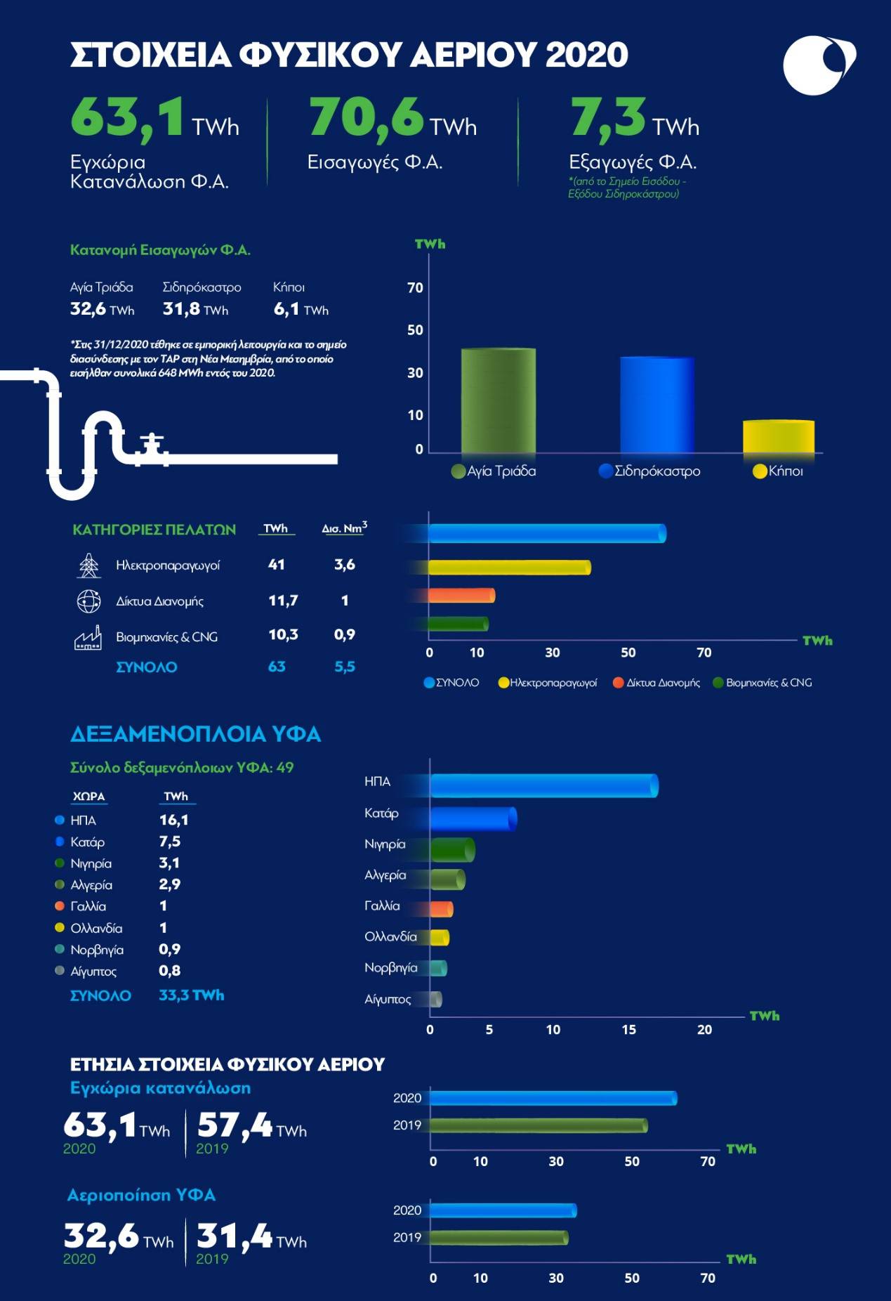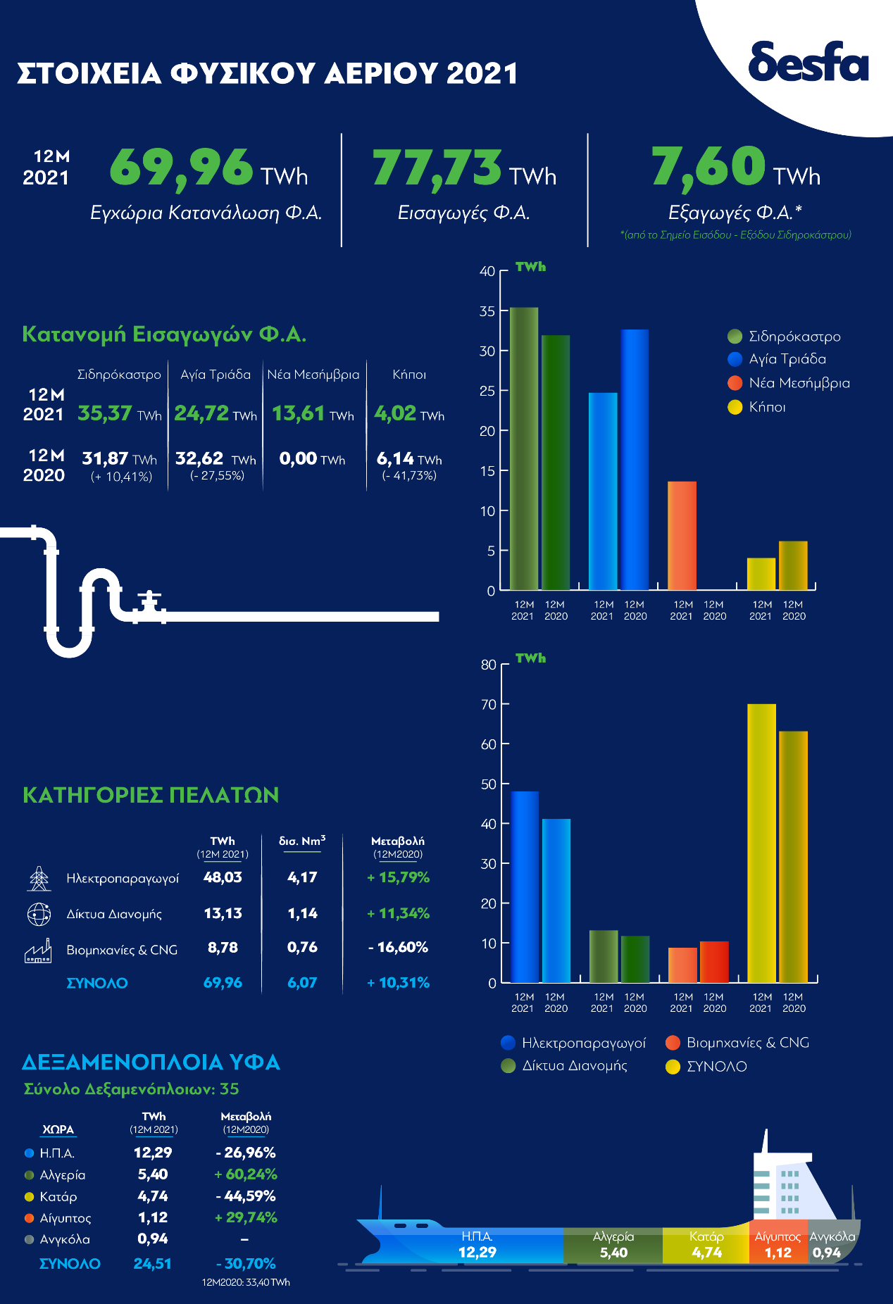 Κατά το πρώτο έτος λειτουργίας του (TAΡ), εισήχθη μέσω του νέου σημείου στη Νέα Μεσημβρία ποσότητα 13,61 TWh, που αντιστοιχεί σε 17,5% επί των συνολικών εισαγωγών, ενώ, περίπου 4,02 TWh (5,17%) εισήχθησαν στο ΕΣΦΑ από το σημείο εισόδου στους Κήπους του Έβρου (τουρκική BOTAS). Σχετικά με τις εκφορτώσεις LNG που πραγματοποιήθηκαν στον Τερματικό Σταθμό της Ρεβυθούσας κατά το 2021, αυτές ανήλθαν περίπου σε 24,51 TWh από 35 δεξαμενόπλοια έναντι 33,40 TWh από 49 δεξαμενόπλοια το 2020. Παρά τη μείωση συγκριτικά με την προηγούμενη χρονιά, σχεδόν το ένα τρίτο (31,8%) του εισαγόμενου φυσικού αερίου προήλθε από εισαγωγές φορτίων LNG.