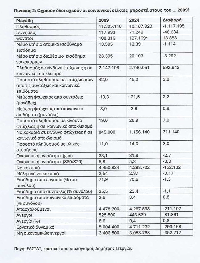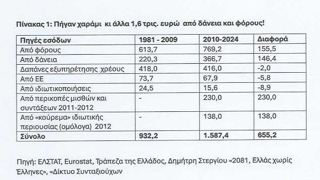 Μολονότι από το 2010 έως και το 2024 εισέρευσαν στα δημόσια ταμεία από φόρους, δάνεια, κοινοτικά πακέτα, ιδιωτικοποιήσεις, περικοπές μισθών και συντάξεων 1,6 τρις. ευρώ, συνετρίβησαν όλοι σχεδόν οι δημογραφικοί, οικογενειακοί, εισοδηματικοί δείκτες!