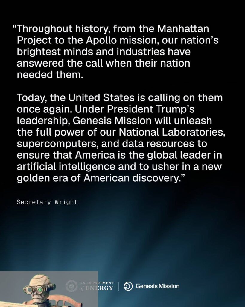 Με το Genesis, οι Ηνωμένες Πολιτείες ουσιαστικά δηλώνουν ότι περνούν πρώτες σε αυτή τη νέα εποχή, με τη νέα μορφή ισχύος να είναι η ίδια η νοημοσύνη που θα κινεί, θα οργανώνει και θα τροφοδοτεί τα πάντα, ως απαρχή ενός κόσμου που θα λειτουργεί με κινητήρια δύναμη τα δεδομένα και την υπολογιστική ισχύ που θα παράγονται στα ομοσπονδιακά datacenters.