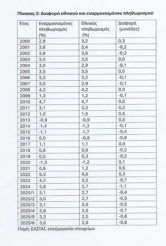 Στις 9 Ιουλίου 2025 η ΕΛΣΤΑΤ ανακοίνωσε ότι ο εθνικός δείκτης τιμών καταναλωτή παρουσίασε τον περασμένο Ιούνιο μεταβολή 2,8% και ο εναρμονισμένος δείκτης τιμών καταναλωτή 3,6%. Δηλαδή, ο εθνικός πληθωρισμός ήταν χαμηλότερος κατά 0,8 μονάδες από τον εναρμονισμένο, όσο ακριβώς και τον περασμένο Μάϊο, όταν στις 10 Ιουνίου 2025 η ΕΛΣΤΑΤ ανακοίνωσε μεταβολές κατά 2,5% και 3,3% αντίστοιχα. Η εμφάνιση του εθνικού πληθωρισμού κατά 0,8 μονάδες χαμηλότερου από τον εναρμονισμένο αποτελεί ρεκόρ μετά το 2000.