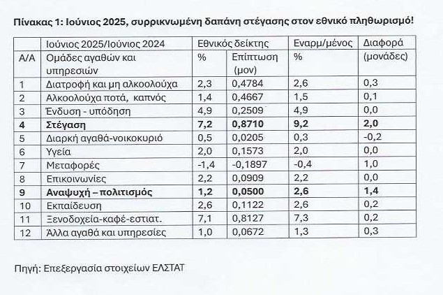 Τα ερώτημα, λοιπόν, είναι ένα απλό και εύλογο: από την επικαιροποίηση αυτών των στοιχείων δαπανών προέκυψε ότι τα καθαρώς ελληνικά νοικοκυριά πλήττονται συνεχώς και επί 27 μήνες λιγότερο από την ακρίβεια από ό,τι τα συλλογικά και οι τουρίστες; Διότι, αν συμβαίνει αυτό, τότε ουαί και αλίμονο! Και η μελαγχολική αυτή διαπίστωση επιβεβαιώνεται από τα στοιχεία του παρατιθέμενου πίνακα 1, από τα οποία προκύπτει ότι τον περασμένο Ιούνιο δύο κρίσιμες ομάδες αγαθών και υπηρεσιών για το κόστος λειτουργίας συλλογικών νοικοκυριών και τις δαπάνες των τουριστών, δηλαδή “στέγαση” και “πολιτισμός-αναψυχή”, εμφανίζονται ακριβότερες από τις αντίστοιχες του εθνικού δείκτη κατά δύο και 1,4 μονάδες! Το ίδιο σκορ παρατηρείται και τον περασμένο Μαϊο στο κόστος στέγασης (ο εθνικός δείκτης είναι χαμηλότερος πάλι κατά μονάδες)!