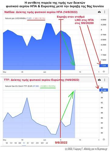 Την περίεργη αυτή ανάστροφη σχέση την είχα προβλέψει από τις 9 Ιουνίου, σε συνεντεύξεις μου στους δημοσιογράφους Λάμπρο Καλαρρύτη και Γιώργο Σαχίνη. Είχα προειδοποιήσει, μάλιστα, ότι οι τιμές σε ΗΠΑ και ΕΕ θα πάρουν αντίθετες πορείες, βασιζόμενος πάντα στις θεμελιώδεις αξίες που διέπουν την οικονομική επιστήμη. Το πρωί της 9ης Ιουνίου κι ενώ ο δείκτης αερίου στις ΗΠΑ κατέγραφε ρεκόρ ανόδου 14ετίας, διάβασα την είδηση σε διεθνή πρακτορεία ότι «στο Τέξας σημειώθηκε έκρηξη σε μεγάλο εργοστάσιο φυσικού αερίου».