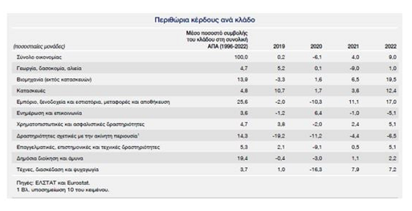 Σε κλαδικό επίπεδο, όπως φαίνεται στον Πίνακα 1, τα περιθώρια κέρδους των ετών 2021 και 2022 εμφάνισαν υψηλούς ρυθμούς στον τομέα της βιομηχανίας αλλά και των υπηρεσιών. Στο βιομηχανικό τομέα, τα περιθώρια κέρδους ξεπέρασαν κάθε υψηλό των τελευταίων δεκαετιών. Αυτή η εξέλιξη θα μπορούσε να αποδοθεί στο υψηλό ενεργειακό κόστος, το οποίο όπως φαίνεται όχι μόνο μετακυλίστηκε στις τελικές τιμές αλλά και οι τελευταίες αυξήθηκαν πολύ παραπάνω, σε συνδυασμό με την αυξημένη ζήτηση που επικράτησε τη συγκεκριμένη περίοδο.