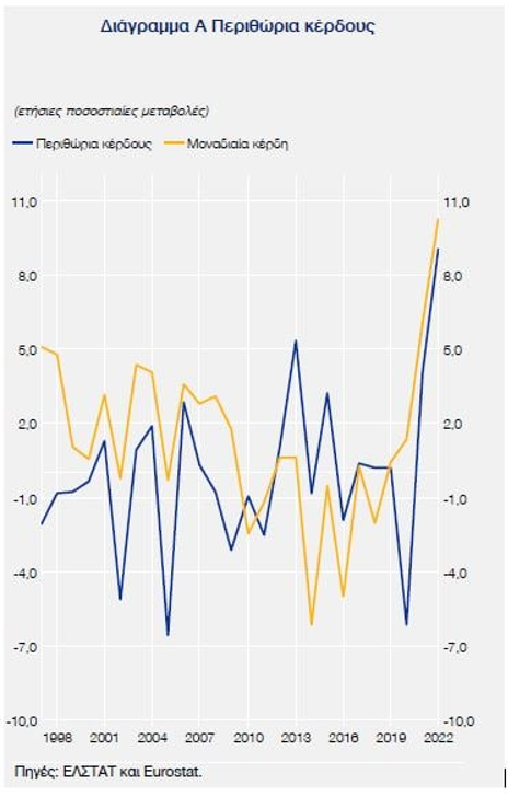 Το Διάγραμμα Α απεικονίζει την ιστορική εξέλιξη και των δύο δεικτών μέτρησης των περιθωρίων κέρδους στην περίπτωση της ελληνικής οικονομίας: του περιθωρίου κέρδους και του μοναδιαίου κέρδους*. Παρατηρείται ότι και οι δύο δείκτες παρουσίασαν έντονα ανοδική μεταβολή τα έτη 2021 και 2022, φθάνοντας τις ιστορικά υψηλότερες τιμές τους. Πιο συγκεκριμένα, ο συνδυασμός της αυξημένης κατανάλωσης που παρατηρήθηκε μετά την πανδημία COVID-19 και το υψηλό κόστος παραγωγής, ιδίως της ενέργειας και των εισαγόμενων ενδιάμεσων αγαθών, συνετέλεσαν σε ισχυρές αυξήσεις τιμών και συνεπώς σε αύξηση των περιθωρίων κέρδους.
