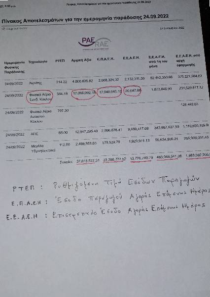 Μία πέμπτη παρατήρηση είναι ότι εφόσον η χονδρική τιμή στις 24 Σεπτεμβρίου (385,41 €/Kwh) είναι μικρότερη από το πλαφόν (564,18 €/Kwh) τα κέρδη των προμηθευτών είναι υπέρογκα ενώ τα έσοδα που προορίζονται για το Ταμείο Ενεργειακής Μετάβασης ( ΤΕΜ) είναι μειωμένα και σχεδόν μηδενικά για το φυσικό αέριο. Μπορείτε να δείτε τον συνημμένο πίνακα, που προέρχεται από το site της ΡΑΕ.