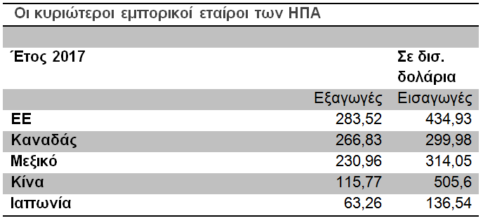Η ΕΕ είναι η μεγαλύτερη αγορά για τις εξαγωγές των προϊόντων- αγαθών που παράγουν οι ΗΠΑ με αξία περίπου 283 δισ. δολαρίων το 2017. Ακολουθούν ο Καναδάς με 267 δισ. δολάρια και το Μεξικό με 231 δισ. δολάρια. Οι εξαγωγές στην Κίνα είναι εμφανώς μικρότερες (116 δισ. δολάρια) και στην Ιαπωνία ακόμη λιγότερες (63 δισ. δολάρια). Βεβαίως οι εισαγωγές των ΗΠΑ είναι μεγαλύτερες από τις εξαγωγές στις συγκεκριμένες χώρες δημιουργώντας το εμπορικό έλλειμμα που θέλει να μειώσει-εξαφανίσει ο πρόεδρος Τραμπ, όπως φαίνεται και στην Εικόνα 1.