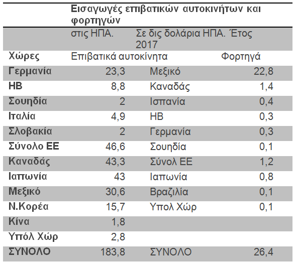 Όμως μετά τη Σύνοδο των G-7 στη Λα Μαλμπέ του Καναδά, ο πρόεδρος Τραμπ δεν φαίνεται να αλλάζει πορεία, προφανώς αισθάνεται σίγουρος για τα αποτελέσματα της πολιτικής του τη στιγμή που οι αντιρρήσεις όλο και πληθαίνουν. Έτσι επανέλαβε την απειλή του για δασμούς στα αυτοκίνητα που εισάγονται στις ΗΠΑ. Η αξία των συνολικών εισαγωγών επιβατικών αυτοκινήτων, το 2017, στις ΗΠΑ ανήλθε σε 183,8 δισ. δολάρια και των φορτηγών σε 24,2 δισ. δολάρια.