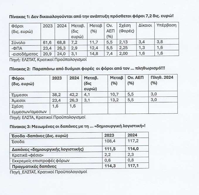 Πρώτον, η μεταβολή τόσο των συνολικών φόρων όσο και του ΦΠΑ (11,7% και 12,4% αντίστοιχα) υπερακοντίζει τη μεταβολή του ονομαστικού ΑΕΠ (5,5%) κατά 2,13 και 2,25 φορές, δηλαδή πάνω από τη μονάδα που προτείνουν οι οικονομικοί νόμοι. Τουτέστιν, 3,8 δισ. ευρώ από τα 7,2 δισ. ευρώ που εξασφαλίσθηκαν το 2024 προέρχονται από αβάσταχτο φορομπηχτισμό κι όχι από την ανάπτυξη. Από την ανάπτυξη δικαιολογείται μία μεταβολή μόνο 3,4 δισ. ευρώ! Άλλωστε, από τον ίδιο πίνακα προκύπτει ότι από την αύξηση του ΦΠΑ κατά 2,9 δισ. ευρώ, μόνο 1,3 δισ. ευρώ δικαιολογείται από την ανάπτυξη. Συνεπώς, η πηγή της ανάπτυξης είναι “τεχνητή”!