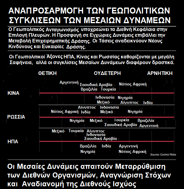 Ο γεωπολιτικός ανταγωνισμός υποχρεώνει τα κεφάλαια να επιλέξουν πλευρές, ενώ η άνοδος των νέων δυνάμεων επιβάλλει μεταβολές στον τρόπο που κινούνται επιχειρηματικά εταιρικά σχήματα και μεγάλοι όμιλοι. Οι επιχειρήσεις που χάρη στην διορατικότητά τους προηγούνται των γεωπολιτικών αναπροσαρμογών, αποκτούν αντοχές στα οικονομικά πλήγματα, τους πολέμους και τις αναταραχές, με θετικό αντίκτυπο στις οικονομίες των χωρών τους. Αντίστοιχα, όσες βασίζονται σε εγχώριες δυνάμεις έχουν μεγαλύτερες δυνατότητες επιτυχίας και συγκριτικά εξελίσσονται αποδοτικότερα. Σε ένα γεωπολιτικό πεδίο που κατακερματίζεται, οι διεθνείς οικονομικές δραστηριότητες επιβάλλεται να επιβιώσουν σε εγχώριο επίπεδο, ώστε να εδραιωθούν και διεθνώς.