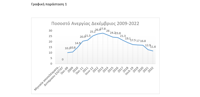 Στη γραφική παράσταση 1 παρουσιάζεται η εξέλιξη του ποσοστού ανεργίας από τον Οκτώβριο 2009 μέχρι και τον Δεκέμβριο 2022 στο τέλος του κάθε έτους (Δεκέμβριος) εκτός αν αναφέρεται διαφορετικά. Ο Οκτώβριος του 2009 είναι ο μήνας που ανέλαβε η κυβέρνηση του Γιώργου Παπανδρέου. Το ποσοστό ανεργίας ήταν στο 10,2%. Το παρέδωσε στην κυβέρνηση του Λουκά Παπαδήμου (Οκτώβριος 2011) στο 20,5%. Η κυβέρνηση των Αντώνη Σαμαρά και Ευάγγελου Βενιζέλου το παρέδωσε στην κυβέρνηση ΣΥΡΙΖΑ-ΑΝΕΛ (Δεκέμβριος 2014) στο 26,0%. Με τη σειρά της η αυτή η κυβέρνηση το παρέδωσε στη κυβέρνηση του Κυριάκου Μητσοτάκη (Ιούλιος 2019) στο 17,5% και τον Δεκέμβριο 2022 το ποσοστό ήταν στο 11,6%.