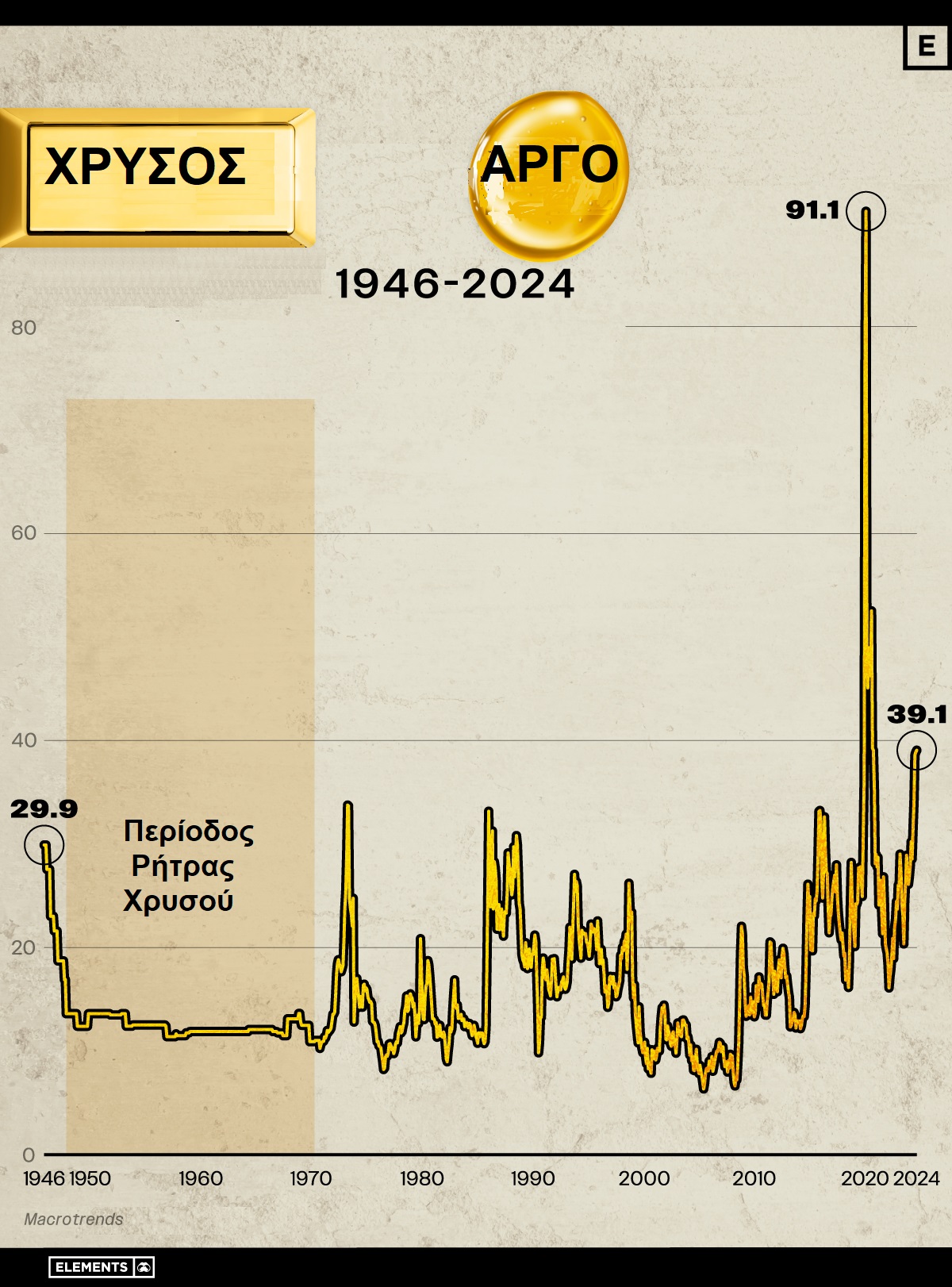 Από το 1950 έως το 1970, η ρήτρα χρυσού και οι σταθερές τιμές του αργού πετρελαίου διατηρούν την σχέση μεταξύ 11 και 13 επί μία εικοσαετία, αλλά μετά το 1980, η διακύμανση μεταβάλλεται δραστικά μεταξύ 6 και 40. Η ακραία περίπτωση εμφανίζεται στο πρώτο δίμηνο των εγκλεισμών της υγειονομικής κρίσης, με την σχέση να εκτινάσσεται στο 91,1, όταν η απότομη άνοδος των τιμών του χρυσού και η συρρίκνωση της ζήτησης αργού δημιουργούν κυριολεκτικά ένα χάσμα. Η ομαλοποίηση όμως μετά την κρίση ανατρέπεται στις αρχές του 2024, όταν η σχέση υπερβαίνει το 26, για να διαμορφωθεί στην λήξη του έτους στο 39 και στην λήξη του πρώτου εξαμήνου του 2025 σε επίπεδα ανώτερα του 51.