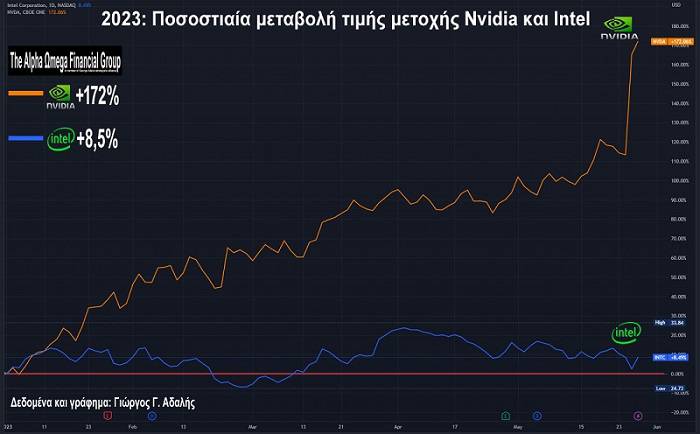 Εάν συγκρίνουμε την μετοχή της NVIDIA με αυτήν της Intel θα δούμε ότι διαφέρουν. Τι προκάλεσε όμως από τη μια την φρενίτιδα της μετοχής της NVIDIA και από την άλλη την αμυδρή άνοδο της Intel; Οι αποδόσεις της ως εταιρία, ή μήπως κάτι άλλο πιο συναρπαστικό; Η αιτία της φρενίτιδας για την απόκτηση μετοχών της NVIDIA, είναι ο καλπασμός της Τεχνητής Νοημοσύνης (AI), ο οποίος δεν αποτελεί μόδα, αλλά κυριολεκτικά αποτελεί μια αγορά όπου οι επενδύσεις δεν έχουν τέλος.