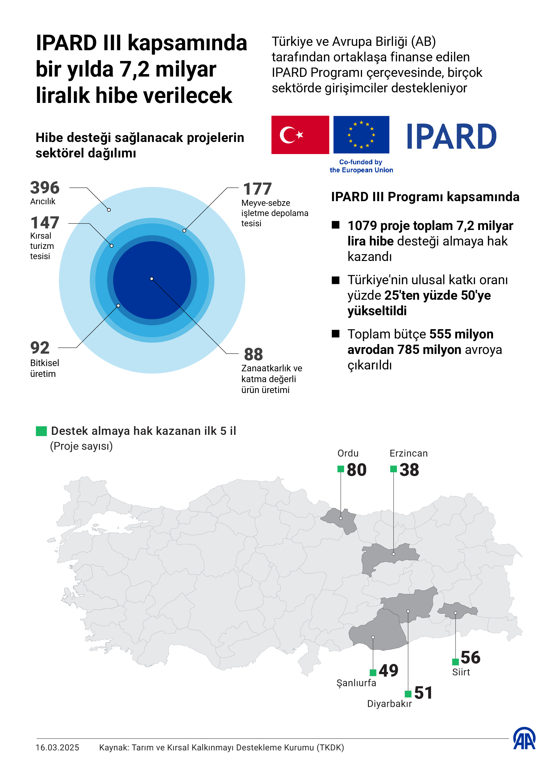Το πρόγραμμα IPARD III, που υλοποιείται από τον Οργανισμό Στήριξης της Γεωργίας και της Αγροτικής Ανάπτυξης (TKDK), στο πλαίσιο του Υπουργείου Γεωργίας και Δασών της Τουρκίας, ενέκρινε επιχορηγήσεις ύψους 7,2 δισεκατομμυρίων λιρών για 1.079 έργα μέσα σε ένα έτος.
