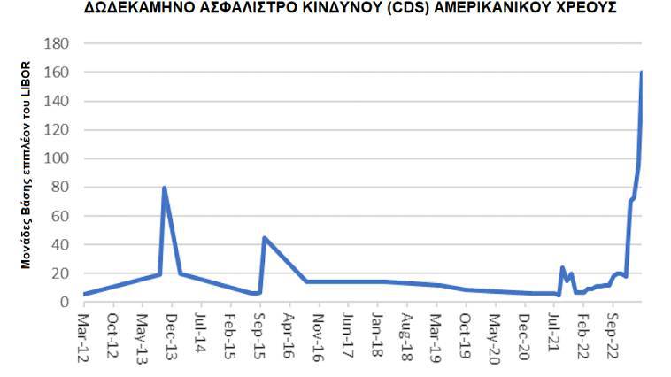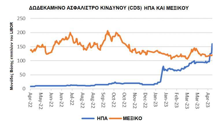 Το κόστος του πενταετούς αμερικανικού Ασφαλίστρου Κινδύνου (CDS), υπερβαίνει το ανάλογο του Μεξικού, δεδομένο που δεν έχει επαναληφθεί στην οικονομική ιστορία, από την εποχή που εισάγονται ασφάλιστρα κινδύνου για τα δημόσια χρέη. Η πολιτική σύγκρουση για το χρέος προσθέτει αβεβαιότητες για την πορεία της αμερικανικής οικονομίας και τις χρηματοοικονομικές αγορές, ενώ εξελίσσονται και τα πλήγματα στις αμερικανικές περιφερειακές τράπεζες.