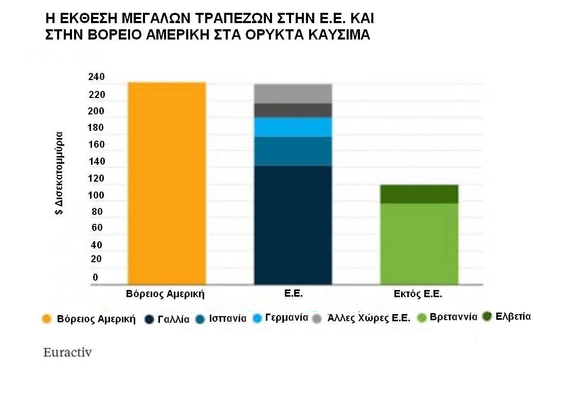 Η οικονομικού χαρακτήρα ερευνών μη κυβερνητική οργάνωση των Βρυξελλών Finance Watch αποκαλύπτει ότι 60 από τις μεγαλύτερες τράπεζες του πλανήτη έχουν αρνητική έκθεση της τάξης των -$1,35 τρισ. στα ορυκτά καύσιμα. Οι τράπεζες της Ασίας συμμετέχουν σε ποσοστό ανώτερο του 50% στην συνολική αρνητική έκθεση. Οι 22 ευρωπαϊκές τράπεζες που διερευνώνται έχουν συνολικά -$239 δισ. από πιστώσεις χρηματοδοτήσεων στον τομέα των ορυκτών καυσίμων. Οι δε αμερικανικές έχουν και αυτές ένα παρόμοιο προβληματικό μέγεθος στο ενεργητικό τους.