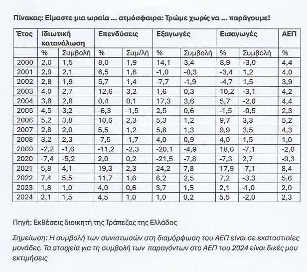 Δεν παράγουμε, δεν εξάγουμε, δεν επενδύουμε, δεν αποταμιεύουμε, αλλά μόνο δανειζόμαστε και τρώμε από… εισαγόμενα και είμαστε χαρούμενοι, όπως και πριν από τα… Μνημόνια για την “υψηλή” στρεβλή ανάπτυξη που έκανε και κάνει ευάλωτη την οικονομία στην παραμικρή κρίση! Μολονότι από τα στοιχεία που ανακοίνωσε η ΕΛΣΤΑΤ για το ΑΕΠ του 2024 προέκυπτε (βλέπε παρατιθέμενο πίνακα), όπως και τα προηγούμενα τρία χρόνια ότι τη μεγαλύτερη συμβολή στη διαμόρφωσή του έχει κυρίως η ιδιωτική κατανάλωση, οι κυβερνητικές δηλώσεις και ανακοινώσεις που τα συνόδευσαν με τη γνωστή επωδό ότι είναι αύξηση (κατά 2,3%) θύμιζαν τον Ψαλμό 150 του Δαβίδ, δηλαδή «αίνους εν χορδαίς και οργάνοις» (στον Ψαλμό είναι «εν οργάνω») και «εν ψαλτηρίω και κιθάρα κυμβάλοις ευήχοις». Δηλαδή, θύμιζαν τους ίδιους ακριβώς χαρακτηρισμούς για «ισχυρή ανάπτυξη» και «ισχυρή οικονομία» κατά τη δεκαετία του 2000.