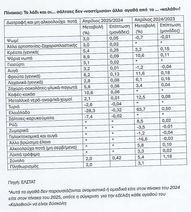 Με εξαίρεση το ελαιόλαδο, που τον Απρίλιο του 2024 είχε αυξηθεί κατά… 63,7% και τον Απρίλιο του 2025 μειώθηκε κατά… 28,3%, και τις… άγνωστες… σάλτσες, όλα σχεδόν τα άλλα αγαθά του “Καλαθιού” υπερακόντισαν σε αυξήσεις τον πληθωρισμό κατά 2% και τις αντίστοιχες του 2024! Από τα στοιχεία που ανακοίνωσε η ΕΛΣΤΑΤ προκύπτει ότι τον προηγούμενο μήνα Απρίλιο ο γενικός δείκτης τιμών καταναλωτή (πληθωρισμός) συρρικνώθηκε στο 2%, έναντι 2,4% του Μαρτίου 2025 και 3,1% του Απριλίου του 2024.