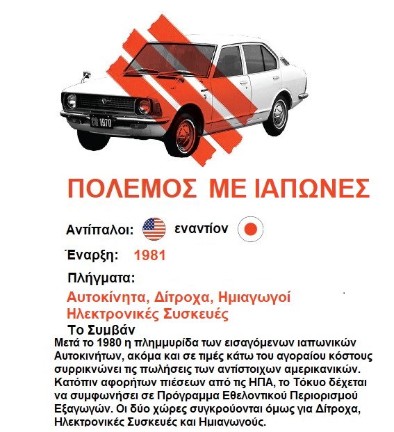 Υποκύπτοντας στις πιέσεις των αμερικανικών βιομηχανιών, η κυβέρνηση του Ronald Reagan, αποφασίζει το 1981 την επιβολή υψηλών δασμών στα εισαγόμενα ιαπωνικά αυτοκίνητα, επεκτείνοντας το προστατευτικό της καθεστώς με επίσης υψηλούς δασμούς στις μηχανές, ανεξαρτήτως κυβισμού, στις ηλεκτρονικές συσκευές και στα προϊόντα ημιαγωγών.