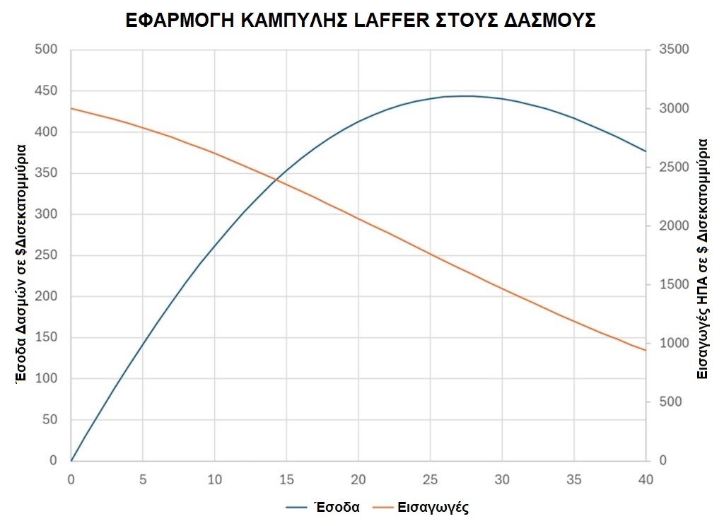 Σαφέστατα οι δασμοί αποτελούν φόρους και η Καμπύλη Laffer εφαρμόζεται χωρίς ιδιαίτερα προβλήματα και στην περίπτωσή τους, αν και υπάρχουν περισσότερες μεταβλητές που τους επηρεάζουν και μία λογική υπόθεση εστιάζεται στο γεγονός ότι σε ένα εύρος της τάξης του 10% έως 15%, θα αποδώσουν σημαντικά έσοδα χωρίς ανατροπές στην οικονομική δραστηριότητα. Οι δασμοί πάντως έχουν πολλαπλές συνέπειες, από την στιγμή που η εσωτερική παραγωγή πρόκειται να υποκαταστήσει μερικές εισαγωγές, ενώ οι επιχειρήσεις θα υποχρεωθούν να απορροφήσουν το μεγαλύτερο μέρος του κόστους τους και μερικοί εξαγωγείς προς τις ΗΠΑ θα αναγκασθούν να δημιουργήσουν παραγωγικές εγκαταστάσεις στην χώρα για να τους αποφύγουν, όπως ακριβώς προτείνει ο πρόεδρος Τραμπ.