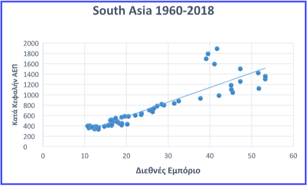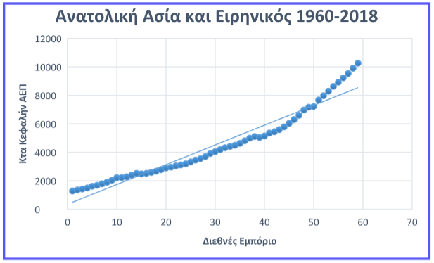 Στο πρώτο διάγραμμα παρουσιάζεται η σχέση της εξαγωγικής δραστηριότητας με το κατά κεφαλήν ΑΕΠ για την ομάδα χωρών της Ανατολικής Ασίας και του Ειρηνικού (εκτός των πλουσίων χωρών, όπως, πχ Ιαπωνία). Η εξέλιξη είναι δυναμική και ο συντελεστής συσχέτισης δείχνει ότι η οικονομική ανάπτυξη στηρίχθηκε σχεδόν απόλυτα στο διεθνές εμπόριο και στην περίοδο ανάλυσης το μέσο κατά κεφαλήν ΑΕΠ αυξήθηκε πάνω από δέκα φορές.