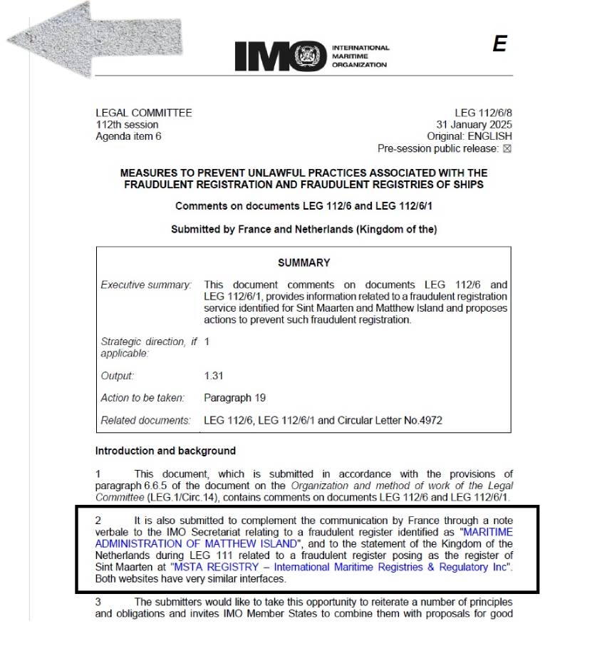 Εκεί θα συζητηθεί και το έγγραφο της Γαλλίας και της Ολλανδίας πριν από το οποίο η Γαλλία είχε ενημερώσει προφορικά τη Γραμματεία του ΙΜΟ για την εμφάνιση του νηολογίου του Matthew Island, το οποίο δέχεται εγγραφές πλοίων σε μια ιστοσελίδα, με τηλέφωνο επικοινωνίας στη Ταϊλάνδη.
