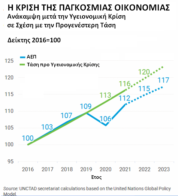 Η παγκόσμια ανάπτυξη πρόκειται να υποχωρήσει στο 2,5% κατά το 2022, μειωμένη περαιτέρω στο 2,2% κατά το 2023, με συνέπεια η επιβράδυνση σε διεθνές επίπεδο να διαμορφώσει το πραγματικό ΑΕΠ σε επίπεδα χαμηλότερα από τα ανάλογα προ της υγειονομικής κρίσης. Στο σύνολο των οικονομιών του πλανήτη, η υποχώρηση πρόκειται να κοστίσει περισσότερα από 17 τρισεκατομμύρια δολάρια, δηλαδή περίπου το 20% των παγκοσμίων εσόδων.