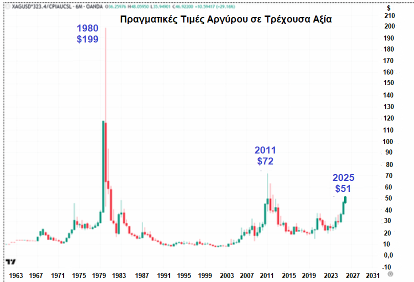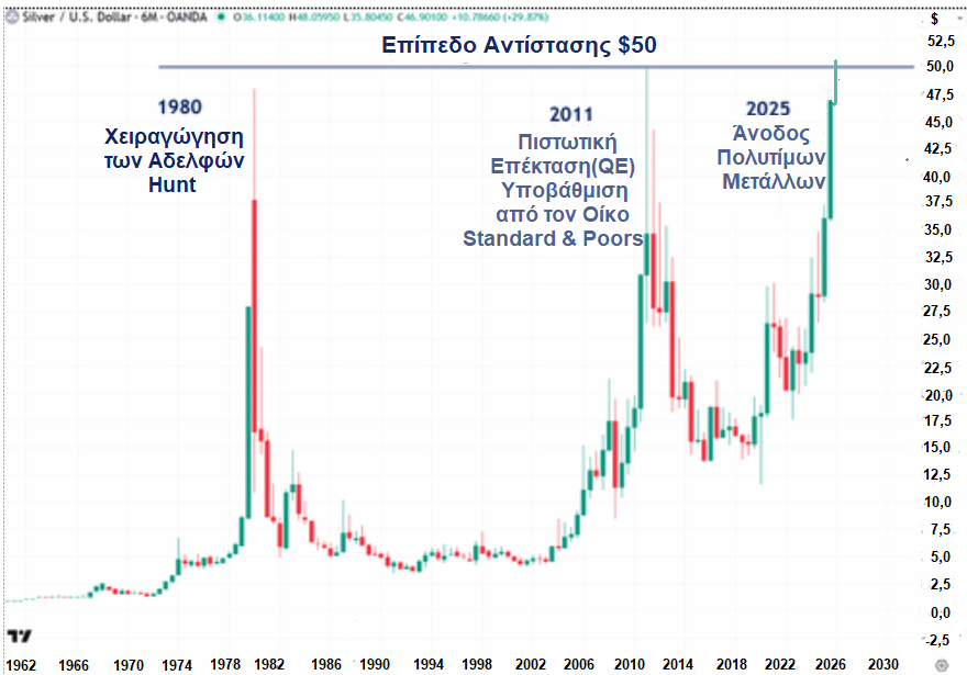 Με τον άργυρο να επιδεικνύει μία ισχυρή ανοδική τάση τιμών, με αύξηση κατά περισσότερο από 50% από τις αρχές του 2025, αυξάνεται ο αριθμός των επενδυτών που ανησυχούν για ενδεχόμενη κατάρρευση τιμών κατά τρόπο ανάλογο με τις αντίστοιχες του 1980 και του 2011. Τότε οι τιμές αναρριχώνται στο κρίσιμο ψυχολογικά επίπεδο των $50, όπως και στην τρέχουσα περίοδο, οπότε κρίνεται λογικό να αναφύεται ένας έντονος προβληματισμός, περιθωριοποιώντας τον μακροπρόθεσμο ορίζοντα ευκαιριών που προσφέρει το πολύτιμο μέταλλο.