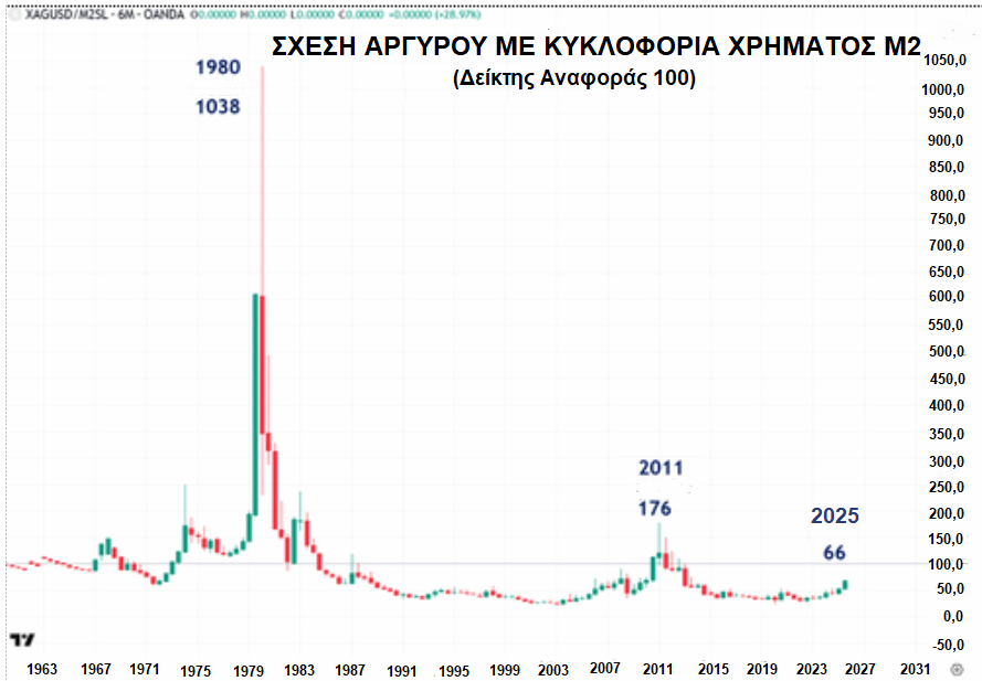 Ένα πρώτο ζωτικό στοιχείο αφορά τον σωρευτικό πληθωρισμό, που εάν συνεκτιμηθεί, τότε τα $50 του 1980 αναλογούν σε $199 το 2025 και τα $50 του 2011 σε $72 το 2025. Ένα δεύτερο ζωτικό και μάλλον περισσότερο αξιόπιστο στοιχείο σε σχέση με τον πληθωρισμό, προκύπτει από την αναλογία των τιμών του αργύρου με την κυκλοφορία χρήματος Μ2, δηλαδή το σύνολο των μετρητών, των καταθέσεων όψεως και όλων των τίτλων που μετατρέπονται άμεσα σε χρήμα. Με βάση δείκτη της σχέσης με τιμή αναφοράς το 100, όταν η τιμή του αργύρου το 1980 αναρριχάται στα $50, ο δείκτης φθάνει το 1.038, ενώ στην περίπτωση του 2011 διαμορφώνεται στο 176 και το 2025 μόλις στο 66.