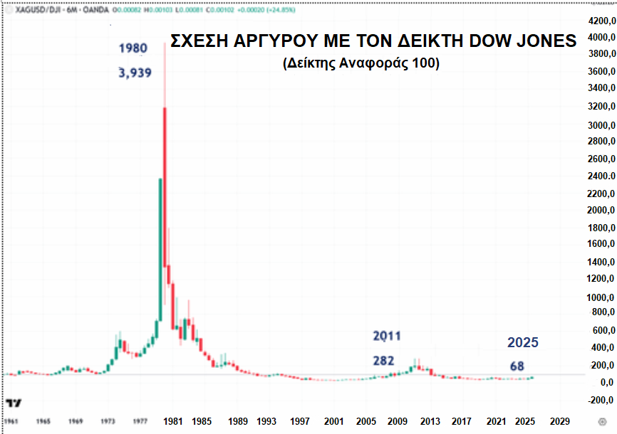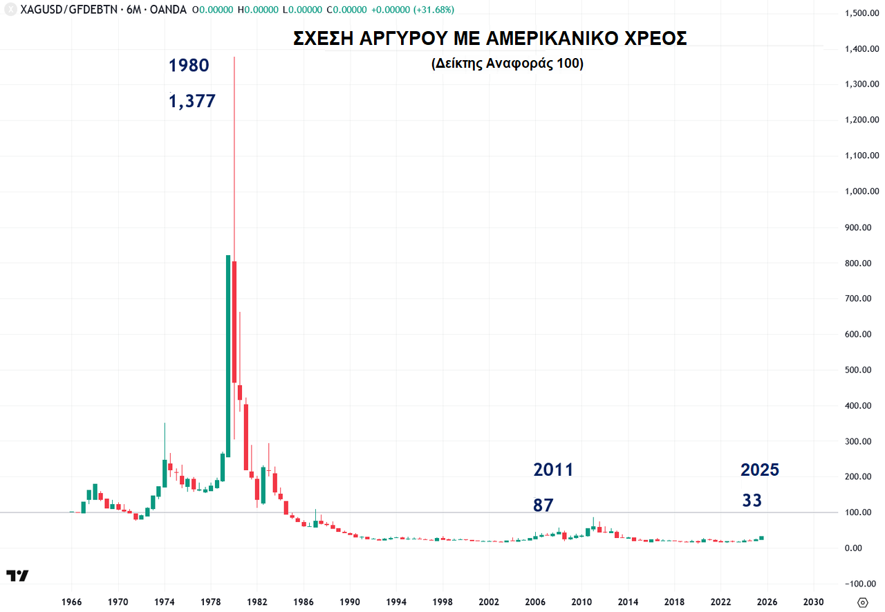 Με βάση δείκτη της συγκεκριμένης σχέσης με τιμή αναφοράς το 100, όταν η τιμή του αργύρου το 1980 αναρριχάται στα $50, ο δείκτης φθάνει το 1.377, ενώ στην περίπτωση του 2011 διαμορφώνεται στο 87 και το 2025 μόλις στο 33. Η τελευταία τιμή προδίδει πως οι τιμές του αργύρου από το επίπεδο των $50 έχουν περιθώρια να κινηθούν ανοδικά σε σύγκριση με το χρέος, χωρίς να αποκλείονται τιμές της τάξης των $100 ανά ουγγιά.
