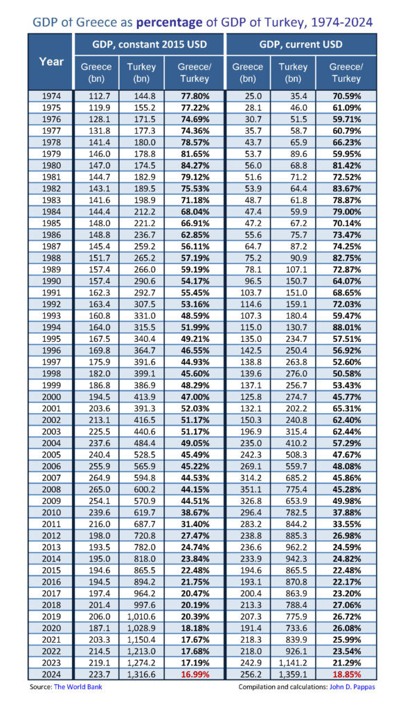 Το 1974, στην αυγή της Μεταπολίτευσης, το ελληνικό ΑΕΠ σε σταθερές τιμές (2015) αντιστοιχούσε στο 77,80% του τουρκικού. Πενήντα χρόνια αργότερα, το 2024, το ποσοστό αυτό έχει κατρακυλήσει στο 16,99%. Με άλλα λόγια, η Ελλάδα από οικονομία που ξεπερνούσε τα τρία τέταρτα του μεγέθους της Τουρκίας, βρίσκεται σήμερα περίπου στο ένα έκτο.
