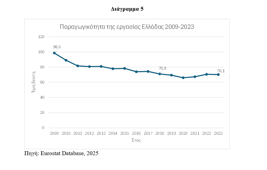Τούτων δοθέντων, η αύξηση της παραγωγικότητας της εργασίας απαιτείται να αποτελεί τον πρωταρχικό στόχο της χώρας μας, ιδιαίτερα εάν παρατηρήσουμε ότι οι χώρες που είναι πρώτες στην παραγωγικότητα της εργασίας είναι χώρες με μικρότερο πληθυσμό από την Ελλάδα όπως η Ιρλανδία, η Νορβηγία, το Βέλγιο, η Αυστρία η Δανία και η Σουηδία. Επίσης εάν σκεφτούμε ότι η παραγωγικότητα της εργασίας στην Ελλάδα το 2009 ήταν στο 98,5% του μέσου όρου της Ευρώπης και το 2018 ήταν 71%, δηλαδή υψηλότερη από στην περίοδο 2019 – 2023 (Διάγραμμα 5).