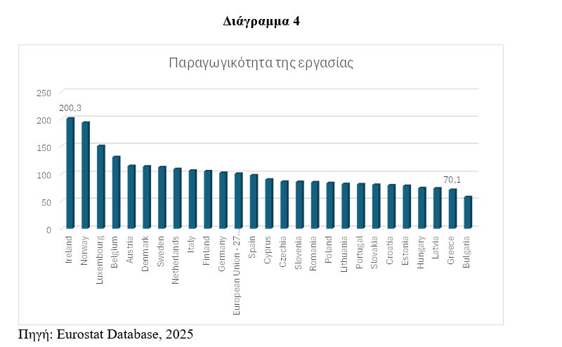 Βέβαια, βασική προϋπόθεση αυτής της συνθήκης αποτελεί ότι η παραγωγικότητα της εργασίας θα αυξηθεί σημαντικά στηριζόμενη στις απεριόριστες δυνατότητες που μπορεί να προσδώσει η ψηφιακή τεχνολογία, η μηχανική, η καινοτομία, η ρομποτική και η τεχνητή νοημοσύνη. Ειδικά για την χώρα μας η παραγωγικότητα της εργασίας έχει σημαντικά περιθώρια βελτίωσης εάν σκεφτούμε ότι το 2023, σύμφωνα με τα στοιχεία της Eurostat, ήταν στην προτελευταία θέση (70% του μέσου όρου των χωρών της Ευρωπαϊκής Ένωσης) (Διάγραμμα 4) πάνω μόνο από την Βουλγαρία.